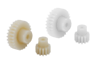 Injection moulded, straight teeth. Engagement angle 20°. Machined bore.