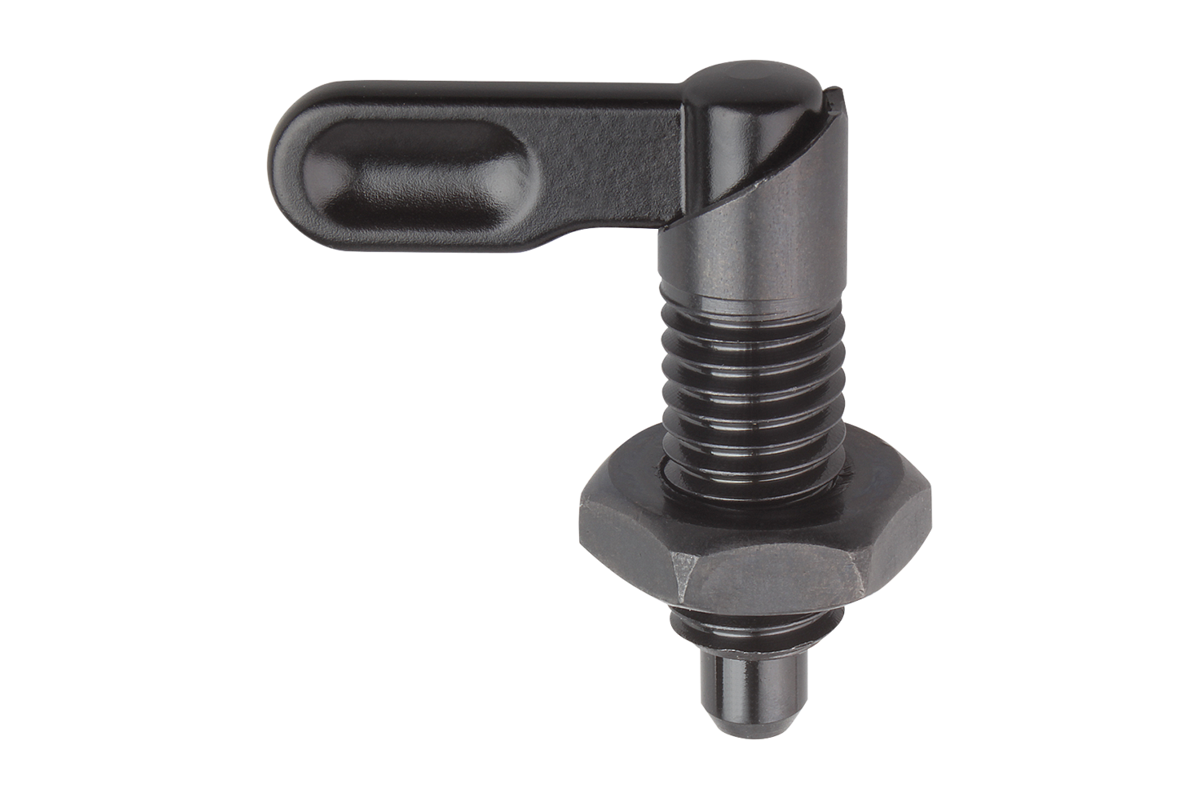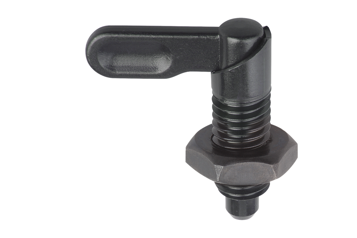 Cam-action indexing plungers are used when the indexing pin should not project all the time. Turning the handle through 180° retracts the pin and a notch ensures that the handle remains in this position.