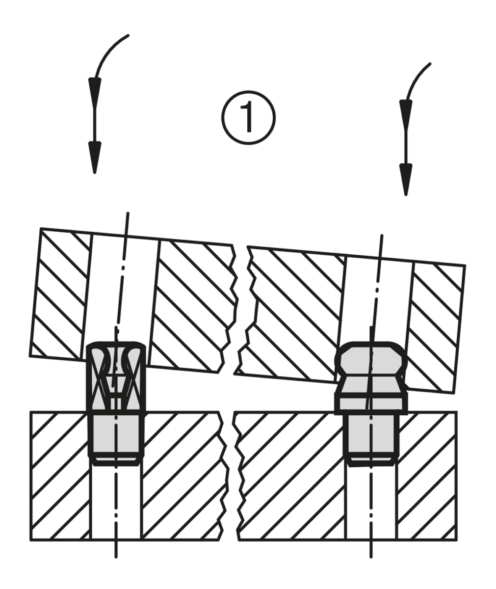Ball end locating pins are specially designed to ease the locating process. The tendency to jam, caused by the locating hole not being at right angles to the pin or by the pushing force not being parallel to the pin axis, is minimized by the ball-end form (see illustration 1)