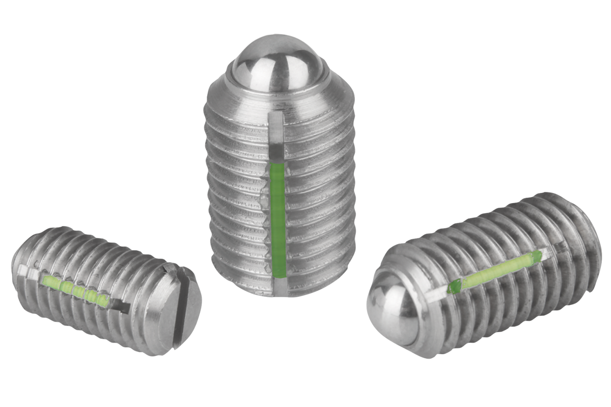 Spring plungers with slot and ball, stainless steel, standard spring force, with thread lock