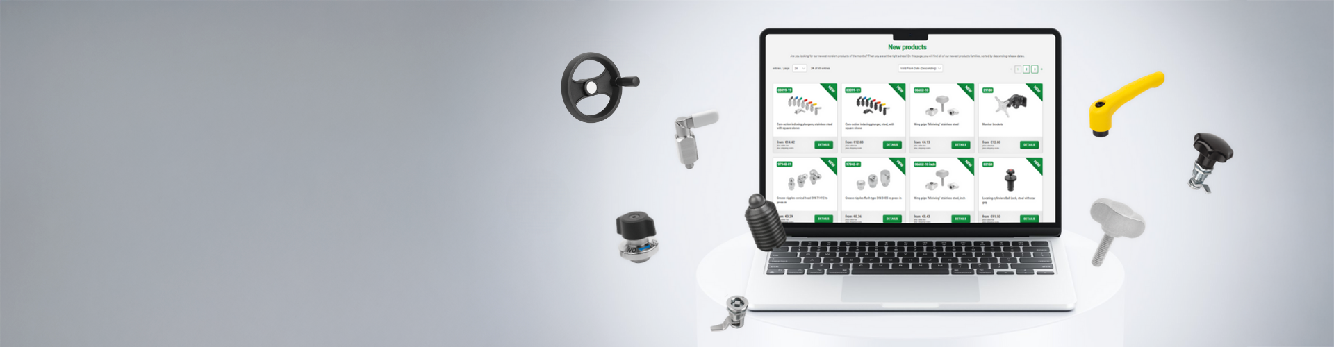 Produktsortimentet 06000 omfattar manöver- och låselement som t.ex. räfflade muttrar och räfflade skruvar, krysshandtag och stjärnhandtag, spännspakar och spännspakar.