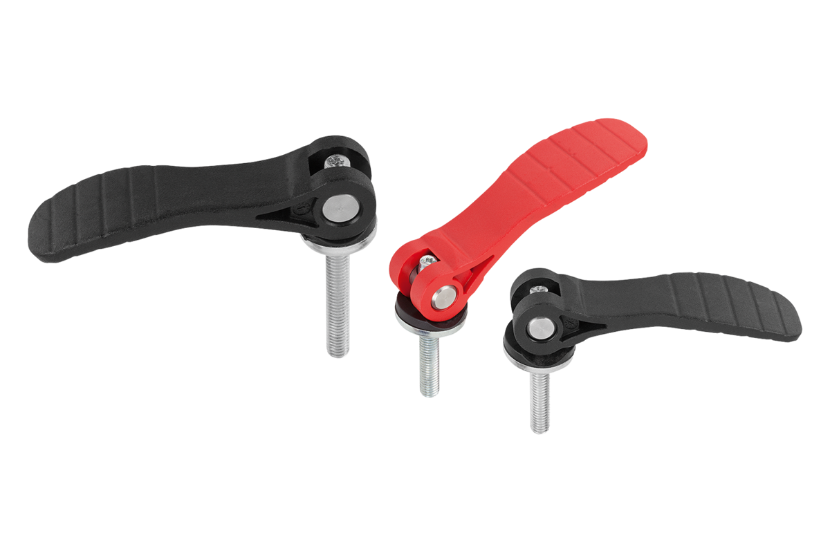 Inställbara excenterspännare används när låsspakens läge mot spännaxeln endast tillåter en viss position (svängradien störs). Med den fina gängan på stiftskruven kan låsspakens position ställas in exakt med en skruvmejsel.