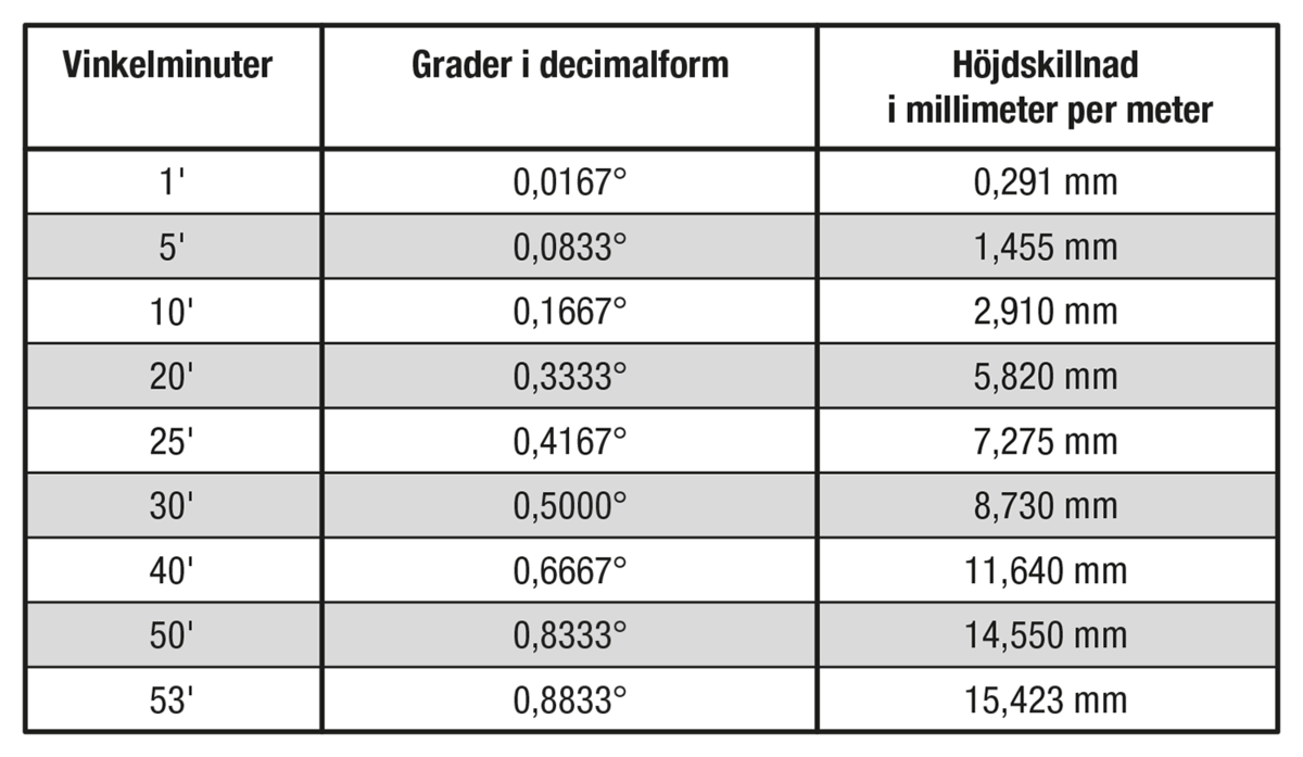 - Känslighet i vinkelminuter på 2 mm blåssträcka