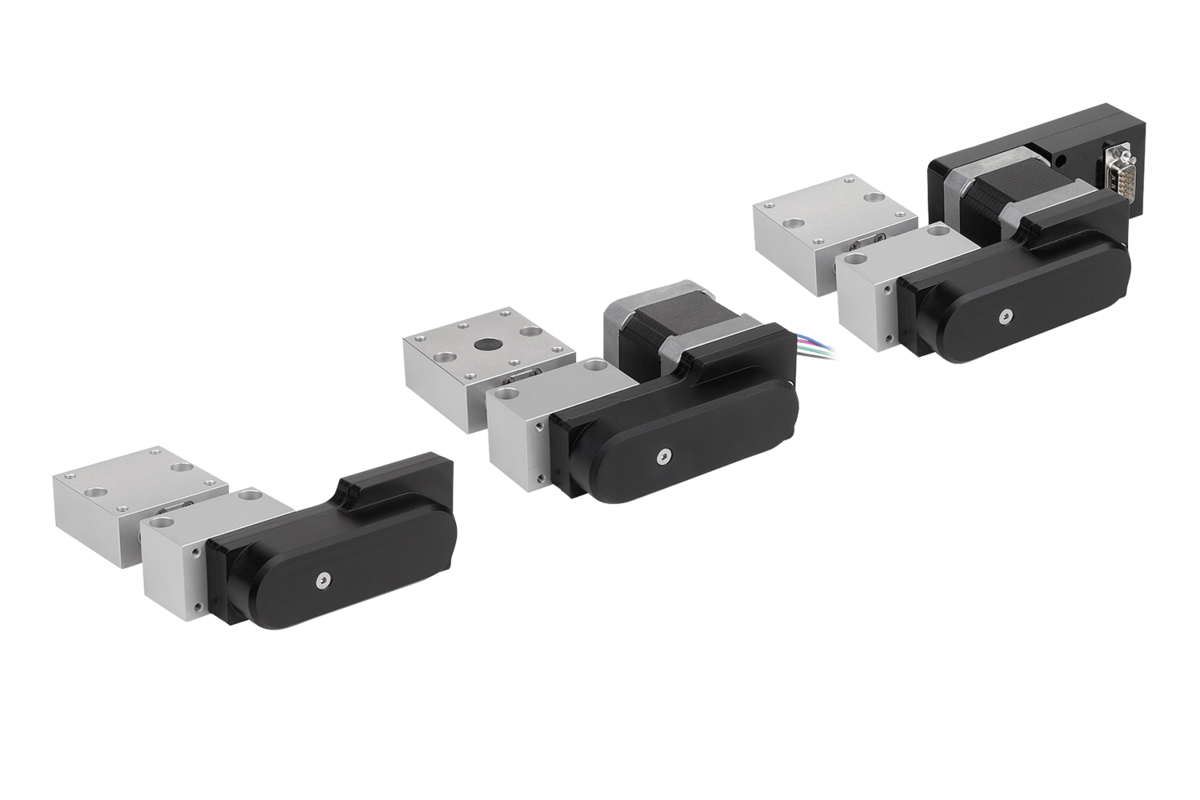 Positioneringsbord för motordriven justering och positionering. Glidbussningarna och spindelmuttrarna är lämpliga för torrgång, men plastglidlagren bör smörjas med fett. Ett passande programmeringsprogram och en gränssnittskabel för stegmotorn med positioneringsstyrning finns som tillbehör (85000-15).