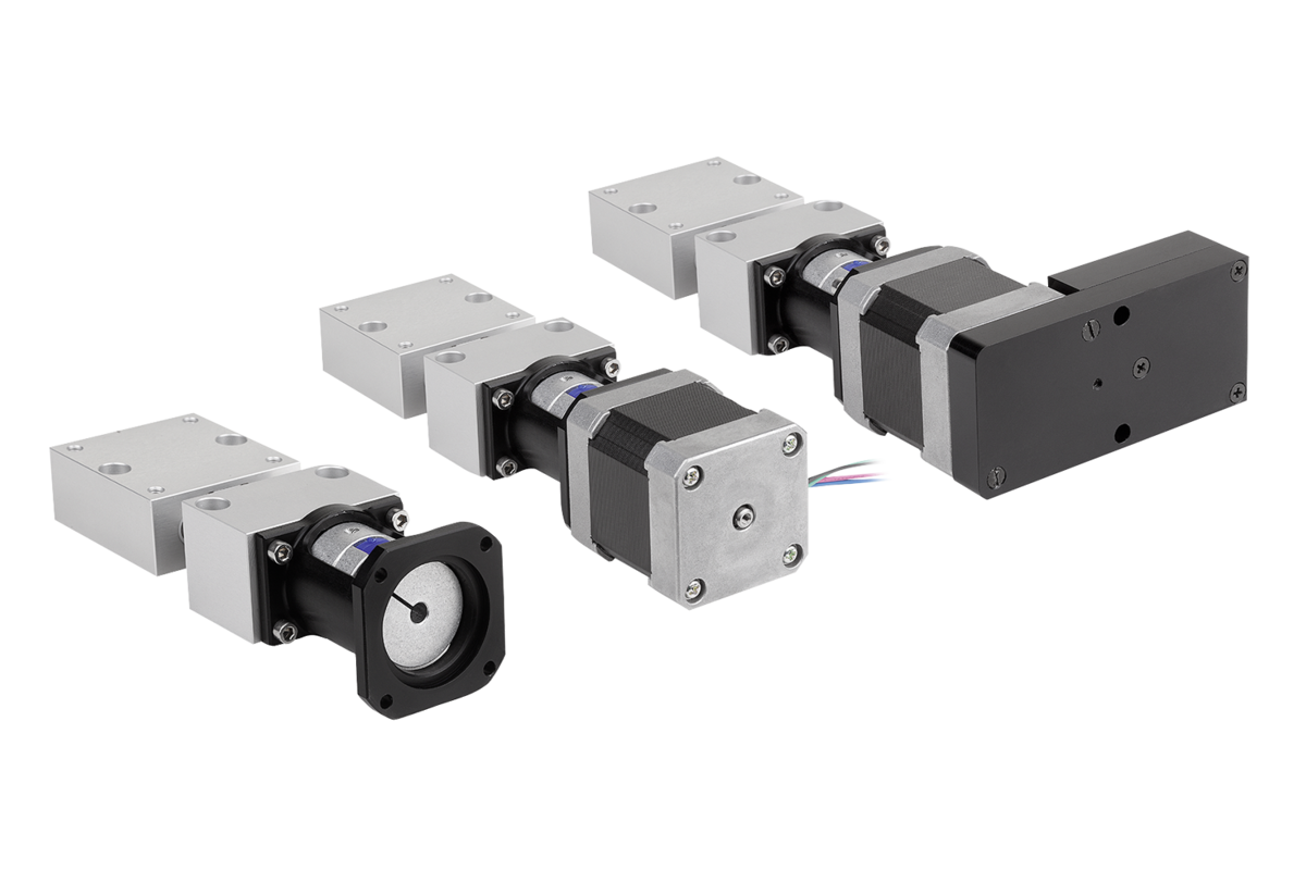 Positioneringsbord för motordriven justering och positionering. Glidbussningarna och spindelmuttrarna är lämpliga för torrgång, men plastglidlagren bör smörjas med fett. Ett passande programmeringsprogram och en gränssnittskabel för stegmotorn med positioneringsstyrning finns som tillbehör (85000-15).
