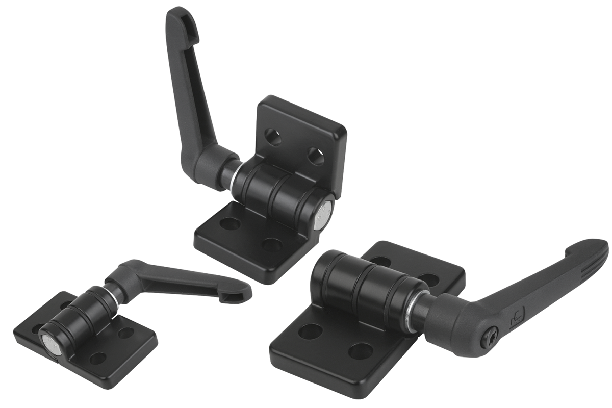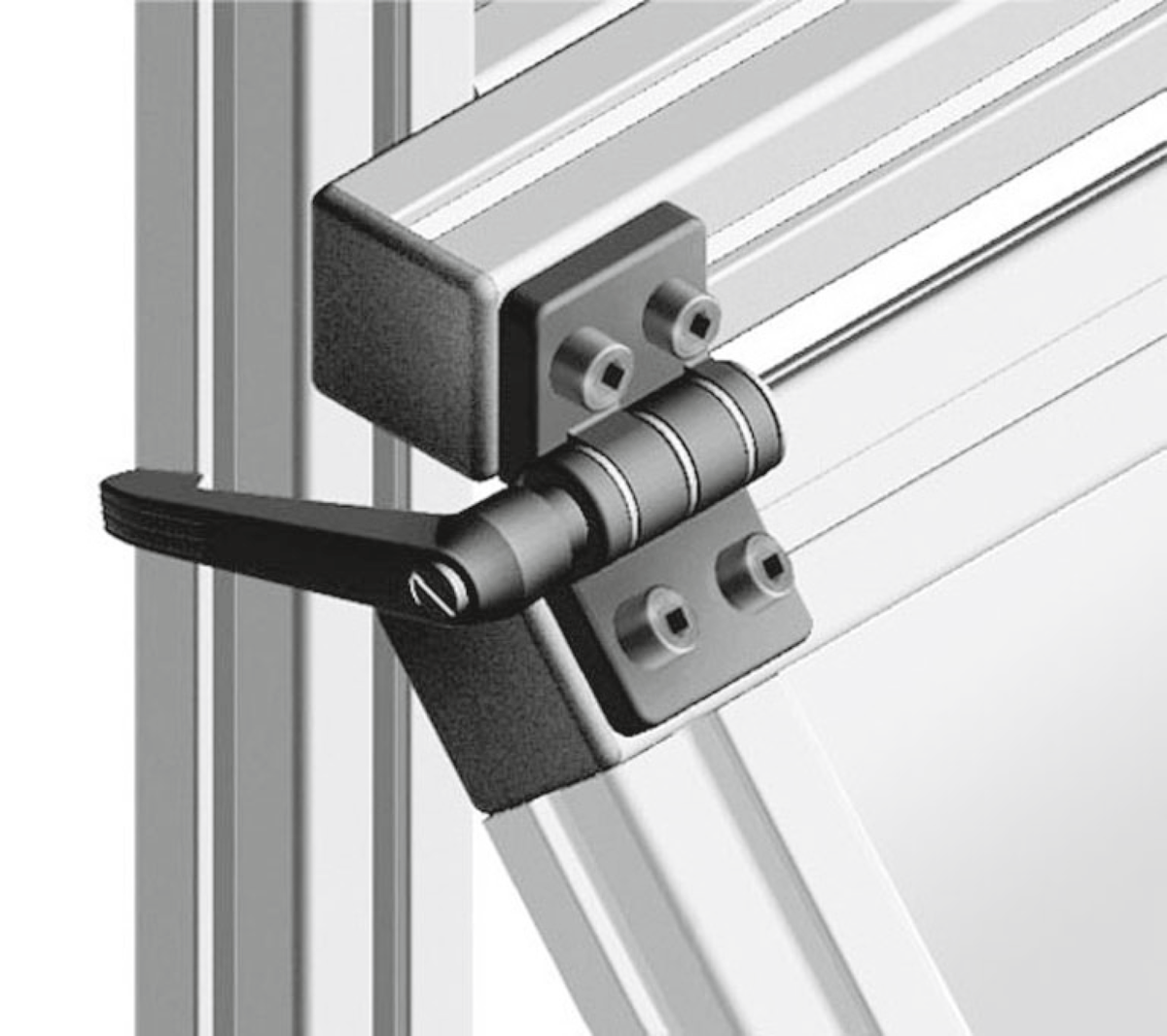 Gångjärnen finns med och utan styrklackar för aluminiumprofiler.