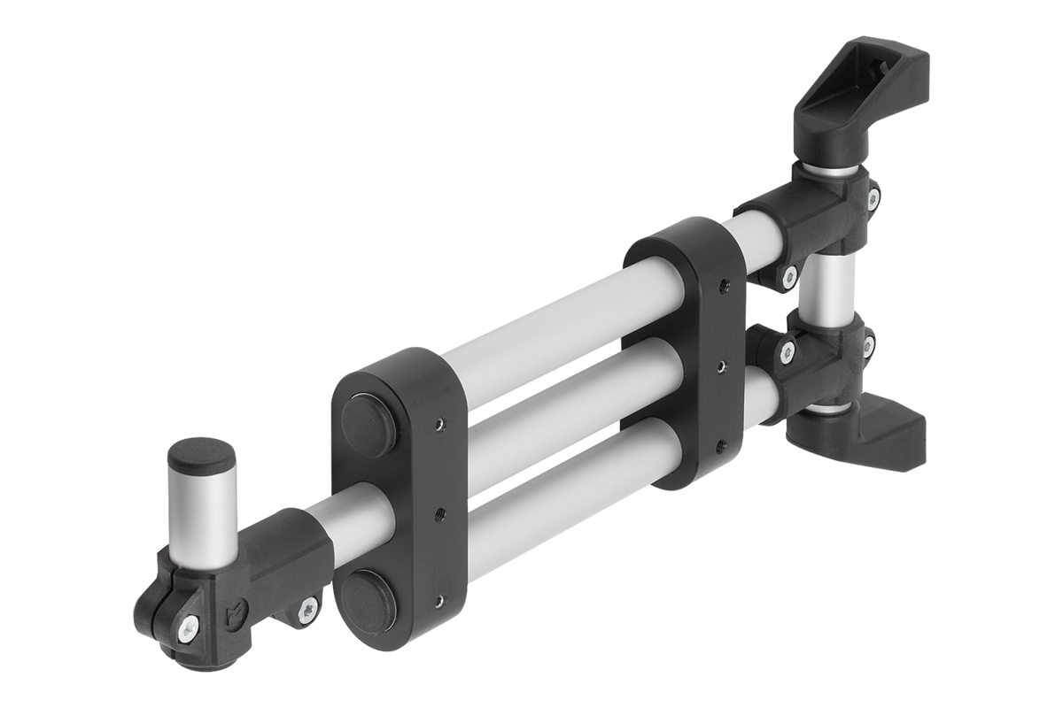 ger ett svängområde på 60°. För belastningar upp till 10 kg (statiskt). Med universalskruvplatta. Hållaren passar för fastsättning på runda rör med Ø30 mm eller fyrkantsrör på 30x30 mm. Via reduceringshylsor 29040, som finns som tillval, kan även andra tvärsnitt användas (runda rör med Ø20 och 25 mm eller fyrkanter 20x20 och 25x25 mm).