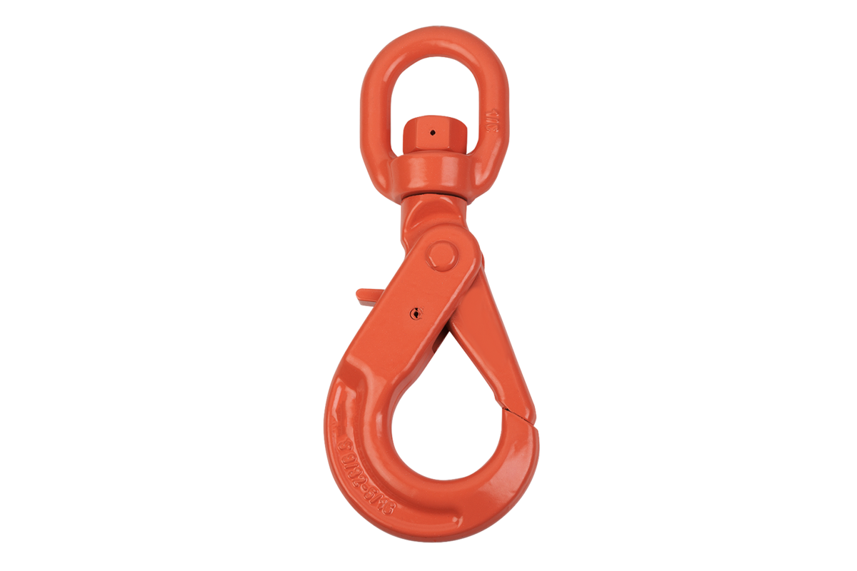 När lasten lyfts stängs säkerhetslastkroken automatiskt och fästs säkert genom en låsanordning på lastkrokens baksida. För att öppna systemet måste låsanordningen aktiveras för hand.