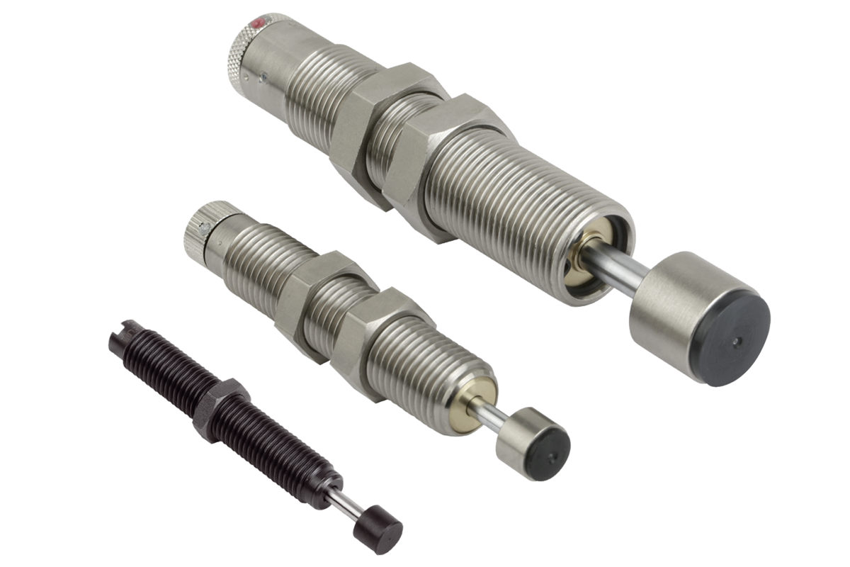 Industristötdämparna är underhållsfria, monteringsfärdiga hydrauliska element. De har ett integrerat fast anslag. Det inställbara utförandet gör att dämpningen kan ställas in exakt. När stötdämparen har monterats kör man anordningen några gånger så att inställningen roterar tills den optimala inbromsningen nås.