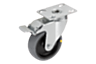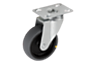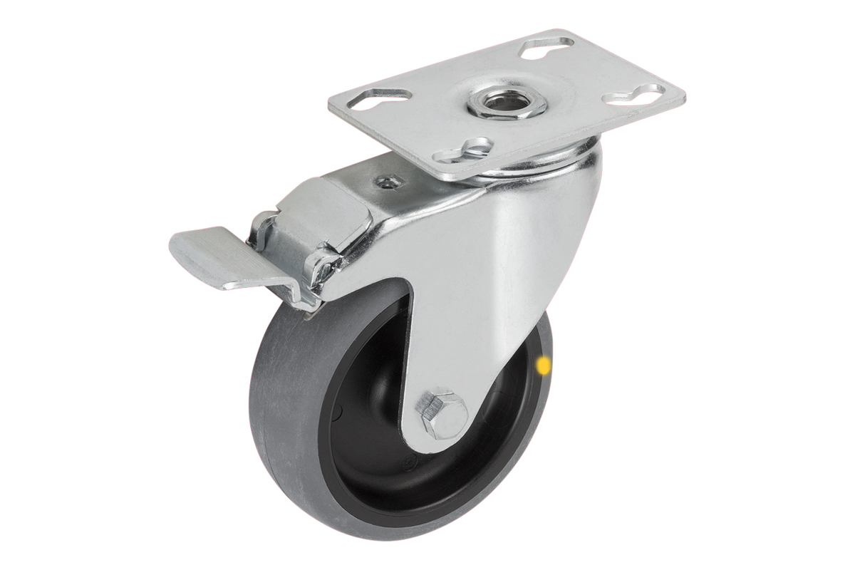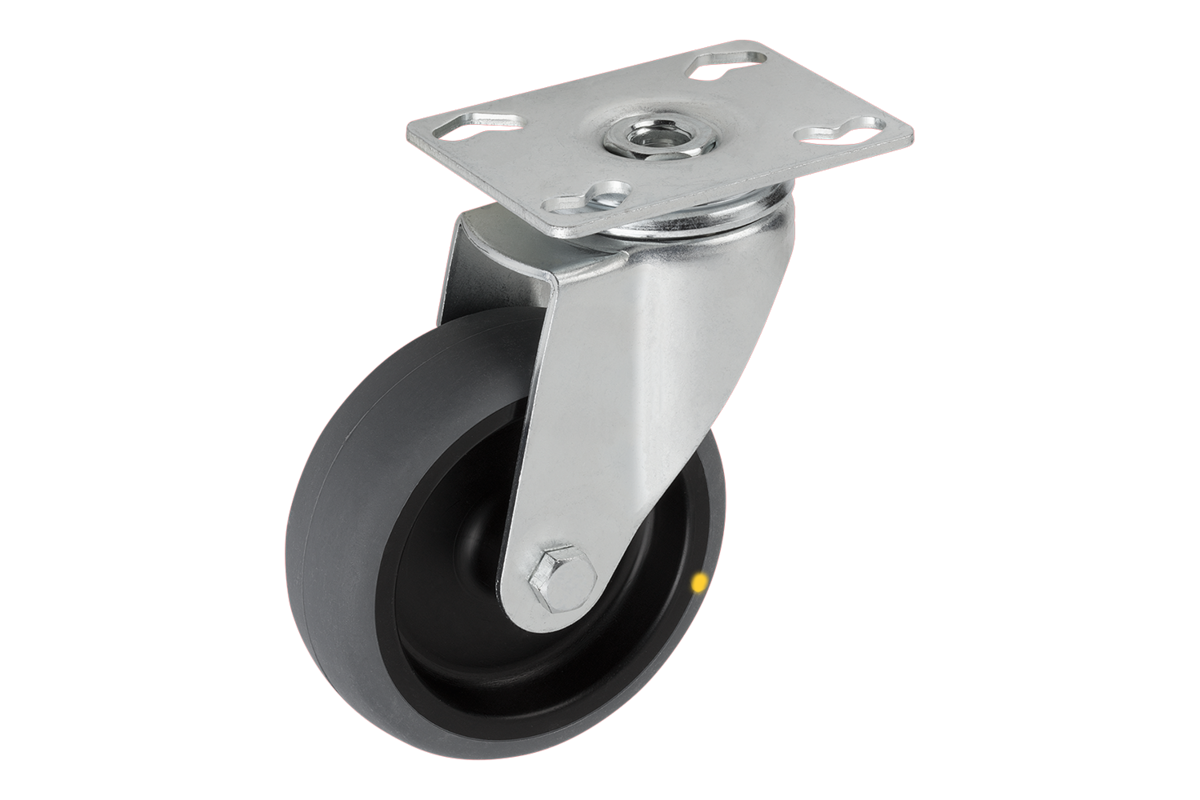 Bultad hjulaxel. Länkhjul med monteringsplatta. Hjul med elektrisk ledningsförmåga, helgrå. Ohm-motståndet på hjulet ligger under 10⁴Ω.