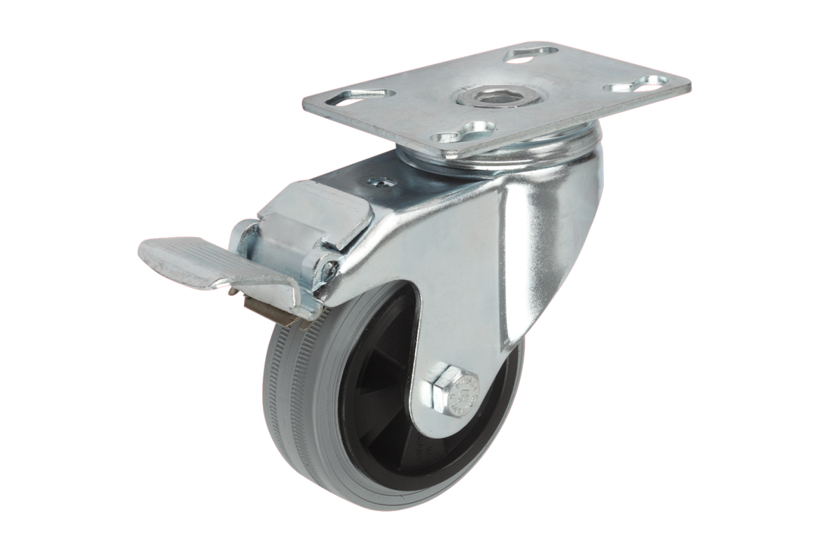 Pressat hus. Länkhjulshus med dubbel kullagring i vridkransen. Hjul med glidlager.